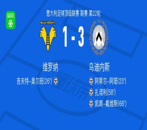 北京时间1月27日,意大利足球顶级联赛第22轮,维罗纳主场对阵乌迪内斯。乌迪内斯率先由阿蒂尔-阿塔破门得分,随后维罗纳由吉夫特-奥尔班扳回一球。上半场结束前,乌迪内斯再度取得进球,扎诺利将比分超出。下半场,阿蒂尔-阿塔送出助攻,凯南-戴维斯破门得手。最终,维罗纳1–3不敌乌迪内斯。